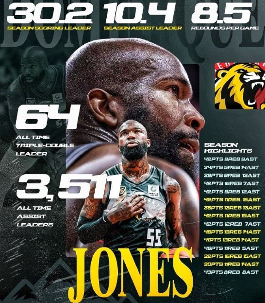 琼斯在NBA生涯当中,他是2010年的首轮25顺位球员,效力独行侠时2011年随队获得总冠军。琼斯在CBA生涯效力过辽宁男篮、吉林男篮、山西男篮、青岛男篮、同曦男篮与新疆男篮,上赛季重返吉林男篮效力。琼斯上赛季代表吉林男篮出场35场,场均39.6分钟得到30.2分8.5篮板10.4助攻2.3抢断的超级数据,依然是联赛助攻王,得分与抢断均是联盟第二。