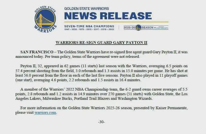 上赛季小佩顿也是在勇士打球,常规赛出战62场首发11次,场均亮相15分钟,贡献6.5分3板1.3助,投篮命中率57.4%;季后赛则出战11场首发1次,场均亮相16.4分钟,得到4.6分2.2助1.5断。