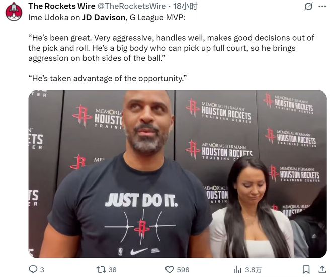 从五星高中生到 NCAA 失意者,从 NBA 边缘人到发展联盟 MVP,如今又得到火箭主帅的力挺,JD - 戴维森的每一步都在跟 “不被看好” 较劲。相关资讯
