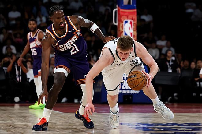 本场比赛中,篮网的替补锋线新秀丹尼-沃尔夫(Danny Wolf)的表现也算是有了一定程度的提升。沃尔夫全场出场12分钟,投篮4中3,三分线外2中2,罚球2中1,得到了9分1篮板4助攻的数据,还有2次失误,正负值为+9。沃尔夫在进攻端也算是展现出了比较全面的得分能力,他也展现出了一定的传球能力和组织能力。在手握大量球权的情况下,他还是刷出了不错的数据。不过沃尔夫在运动能力和移动速度方面的短板依然是非常明显的,他的数据也是建立在手握大量球权的基础上的。最关键的是,篮网面对的是太阳的第三阵容球员,球队当时的竞争力已经比较有限了。在这种情况下刷出不错的数据,事实上也是有些缺乏说服力的。