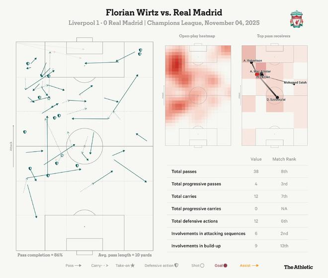 斯洛特完全有可能在客战曼城时采取不同的策略,但昨晚的左路角色应该成为维尔茨一个严肃的选择。正如这场对阵皇马的表现数据图所示,他并未被局限在左翼,而是显著参与了进攻组织,尤其是与索博斯洛伊的配合非常默契。