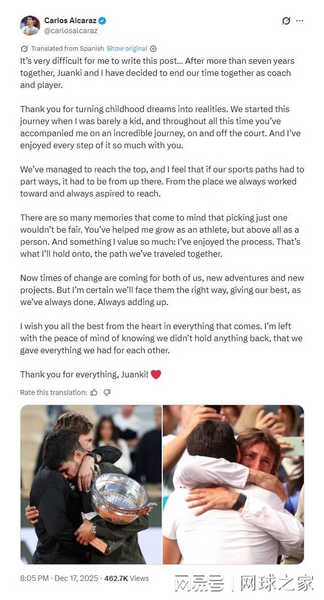 近日,现世界第一阿尔卡拉斯突然通过社交媒体宣布,结束与自己相伴七年的教练的合作关系,舆论瞬间哗然。