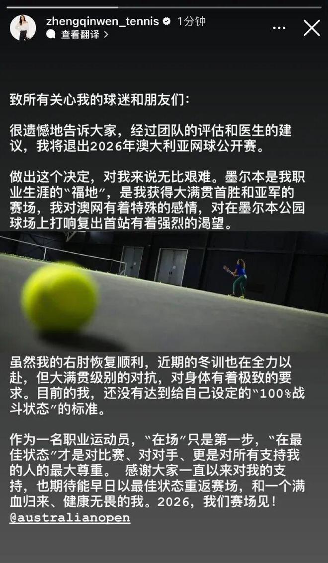 就在刚刚,郑钦文在社交媒体上发文,宣布退出2026澳网。