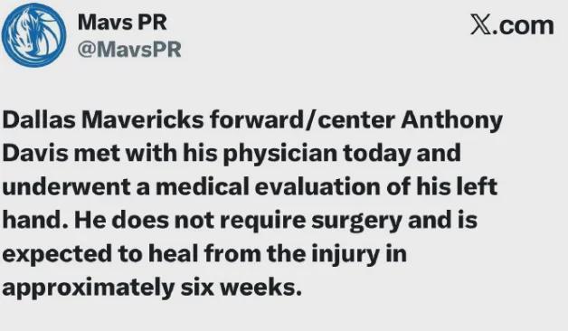 独行侠官方宣布:浓眉哥的左手伤势无需手术,大约六周内即可恢复。